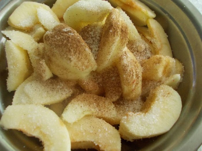Яблоки очищаем от кожуры, вырезаем внутренность и режем дольками. К яблокам добавляем сахар, соль, корицу и оставляем на 15 -20 минут.