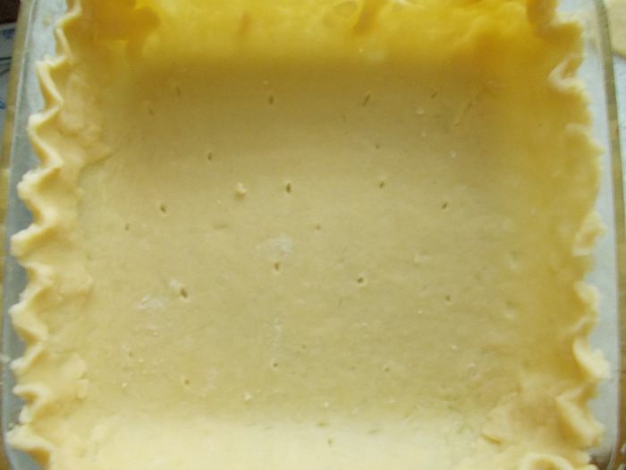 Духовку разогреваем до 180 градусов.Тесто делим на две части. Треть откладываем в сторону для украшения. Стол обильно посыпаем мукой. Раскатываем тесто толщиной в 1- 1.5 см. Выкладываем в предварительно смзаную подсолнечным маслом форму. Прокалываем тесто вилкой или ножом и ставим на минут 15 в холодильник.