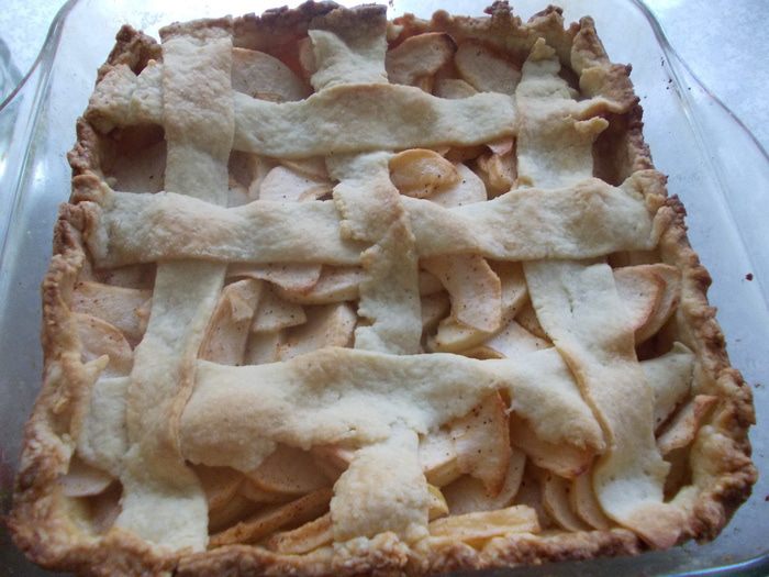 Оставшуюся треть теста раскатываем тонким слоем, режем полосками. Достаем форму из холодильника. Выкладываем яблоки и сверху выстилаем заранее подготовленные полоски теста, для украшения.
