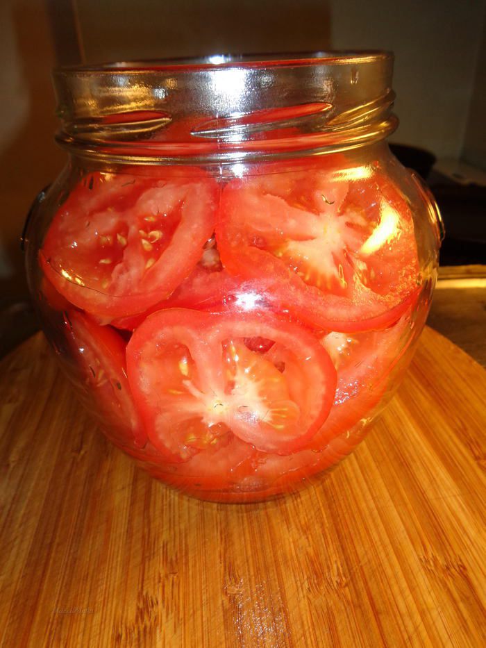 Все предельно просто. Помидоры моем и режем кольцами. Выкладываем в банку.