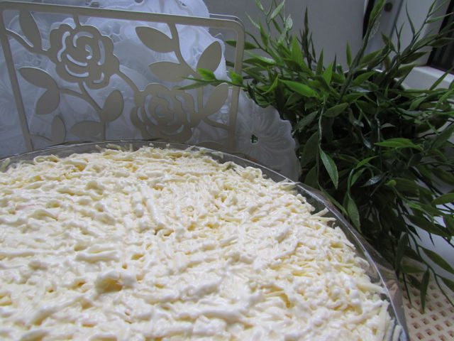 Следующий слой – сыр. Аккуратно примять сыр и слегка смазать майонезом. Можно добавить чесночок, через пресс.