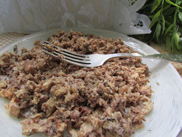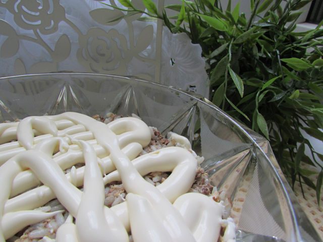 Следующий слой – яйца + консервы с рыбой. Сверху майонезная сеточка.
