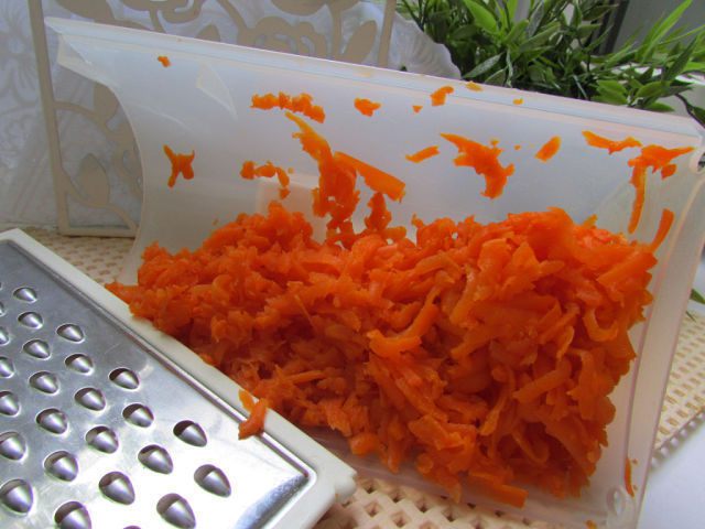 Отварить морковь. Остудить, почистить и натереть на крупной тёрке.