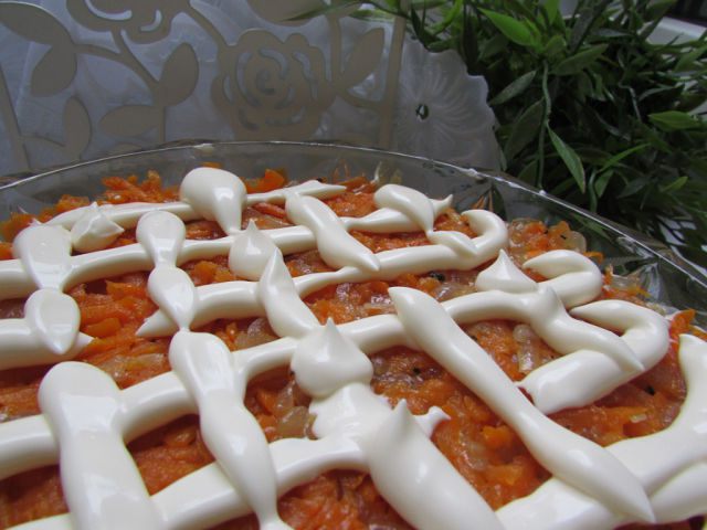 Затем морковь с жареным луком. Поверх майонезная сеточка.