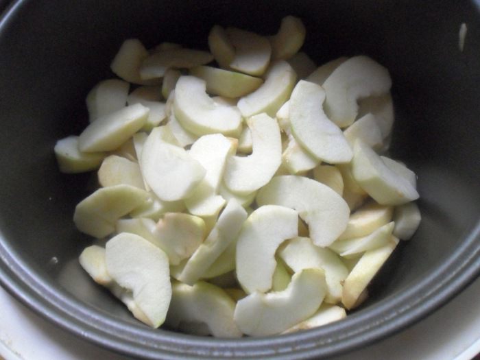Яблоки вымыть, очистить от кожицы и семян, нарезать ломтиками и сложить в чашу мультиварки. Влить 1/4 мульти- стакана воды и включить режим "Тушение" на 1 час.