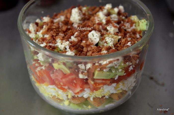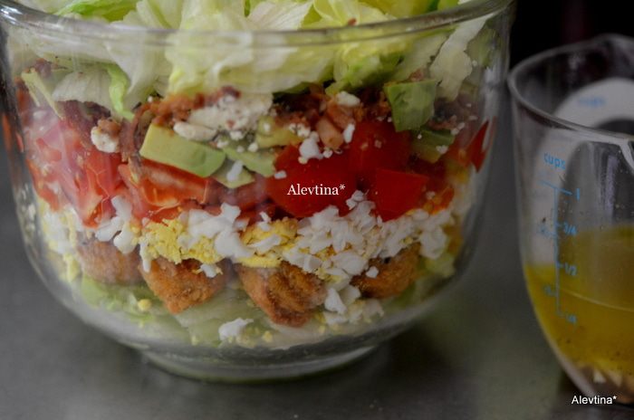 Этот салат выкладывают слоями или на большом плоском блюде. Подают с заправкой.