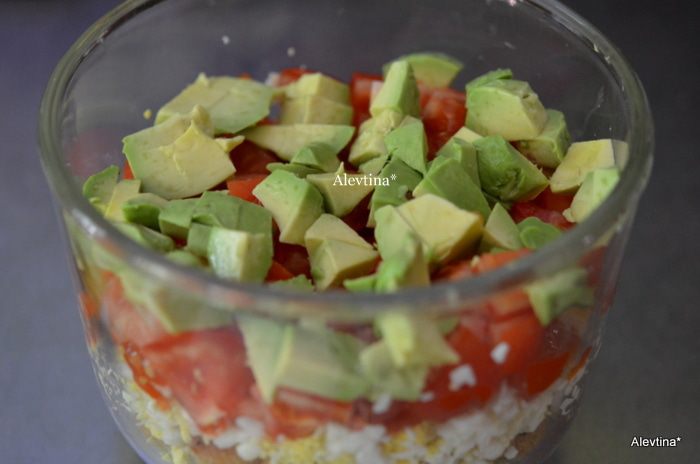 Порезать помидоры кубиками, очистить авокадо от кожуры и ядра, порезать кубиками, выложить слоями.