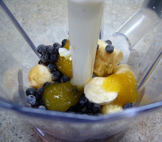 Банан очистить и разломать на кусочки. Сложить в блендер все ингредиенты, взбить до однородности.