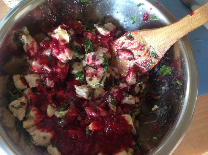 Положить все ингредиенты в миску с индейкой, посолить, поперчить и перемешать. Добавить клюквенный соус и перемешать еще раз. Клюквенный соус делаем по своему рецепту.