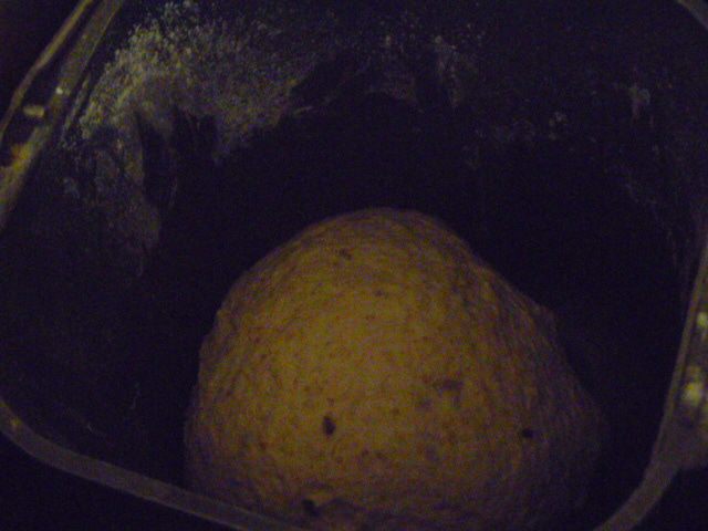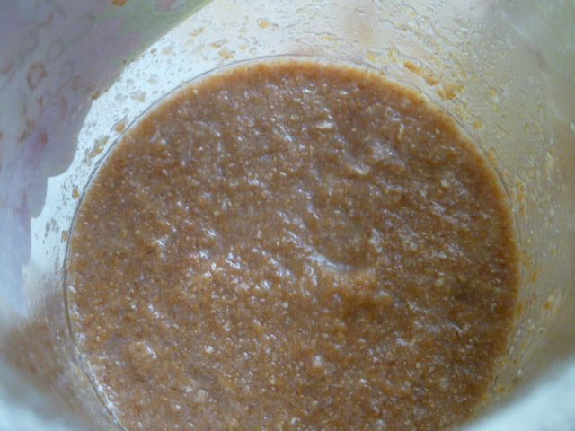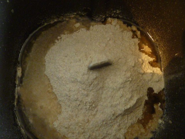 Насыпать 3 ст.л. с горкой цельнозерновой муки, 2 ст.л. с горкой измельченных овсяных хлопьев, 2 ст.л. с горкой ржаной муки.