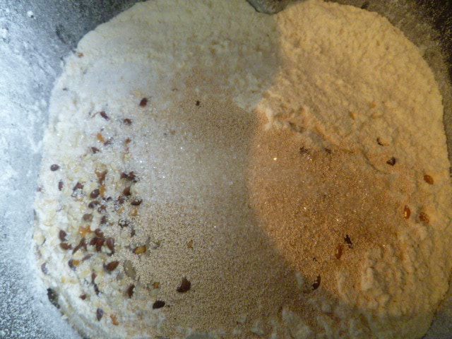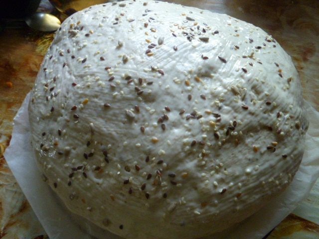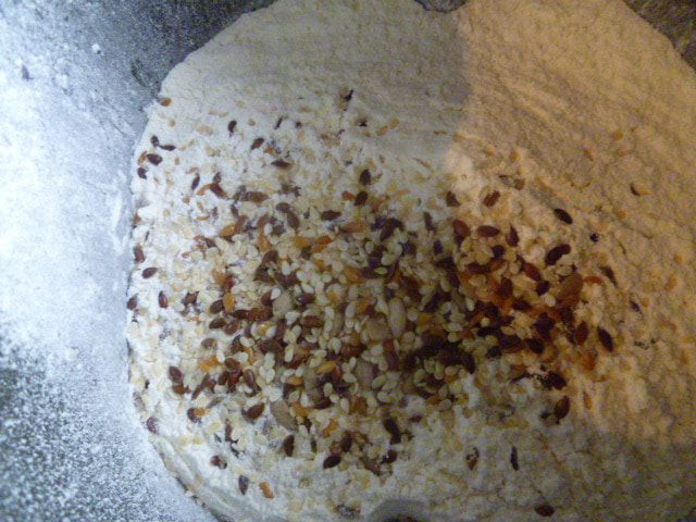 Сверху 3 стакана (250 мл) просеянной пшеничной муки. И 1 столовую ложку зерновой смеси (семена льна, кунжут, очищенные семечки подсолнуха).