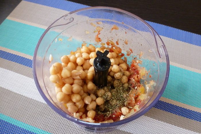 К измельченным овощам всыплем вареный нут, прованские травы, соль. Измельчим еще раз.
