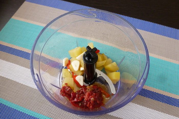 С огурца счистим шкурку, с вяленых томатов тоже лучше снять кожицу. В блендере измельчить огурец, вяленые томаты, чеснок и чили.
