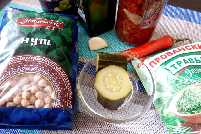 Всем, кто любит нут советую приготовить эту незамысловатую закуску. Вяленые томаты и маринованный огурчик придают особую пикантность этому паштету. Для него возьмем нут от ТМ «Националь».