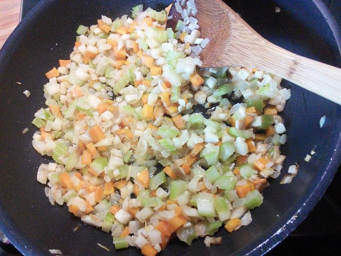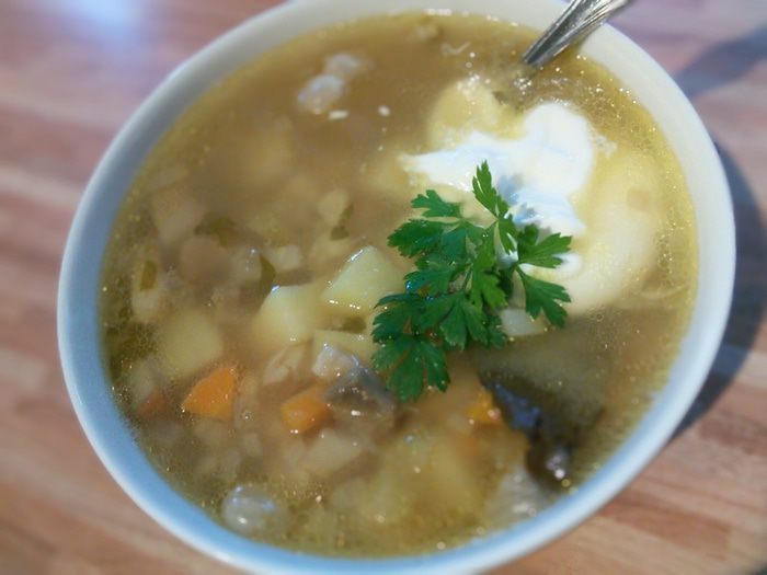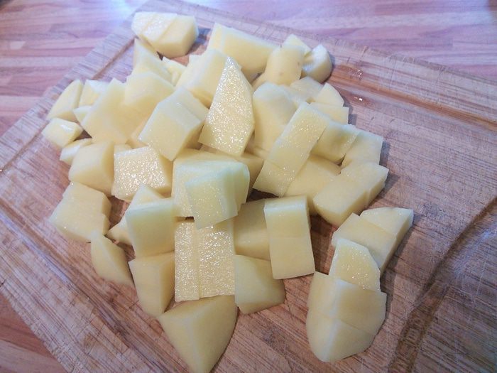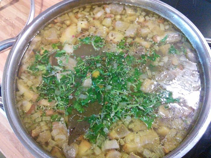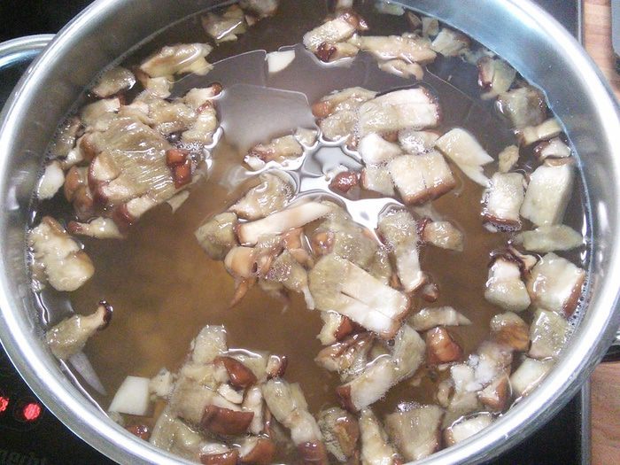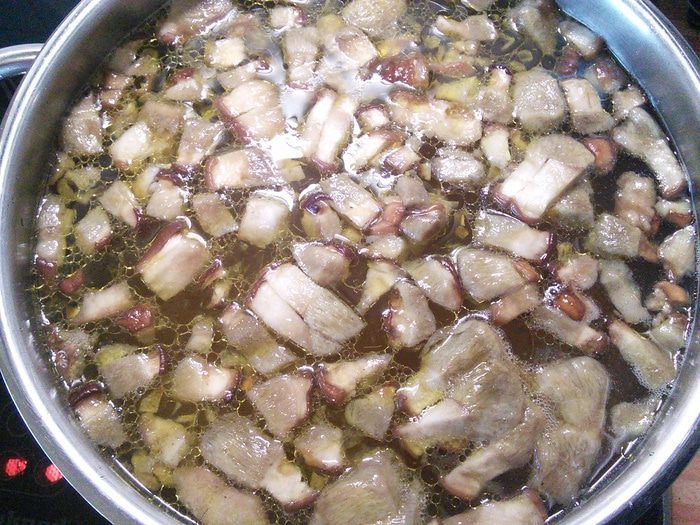 Поставить варится фасоль, предварительно замочив ее в воде на ночь. Грибы почистить, я их споласкиваю под тонкой струйкой воды. Шляпки отделить от ножек и отдельно нарезать, ножки кубиком, шляпки пластинками. Шляпки ошпарить кипятком, откинуть на сито и когда вода стечет, переложить в кастрюлю с наполовину вверенной фасолью и варить в течении еще 40 мин. до готовности фасоли. Т.к. мои грибы заморожены, я эти процедуры опускаю и кладу шляпки сразу в воду вариться.