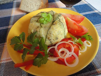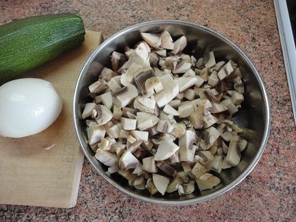 Рецепт взяла на кулинарном сайте К сожалению, имя автора так защифровано, что-то типа iii. В любом случае, спасибо автору за рецепт.В оригинале использовался кабачок, но у меня был цукини. Еще я уточнила количество шампиньонов и обжаривала цукини на сковороде без масла, в отличии от авторского рецепта. У автора очень подходящая форма для запекания - типа пиалы. У меня такой огнеупорной не нашлось и я использовала то, что имелось. Этого количества продуктов хватает на две порции.
