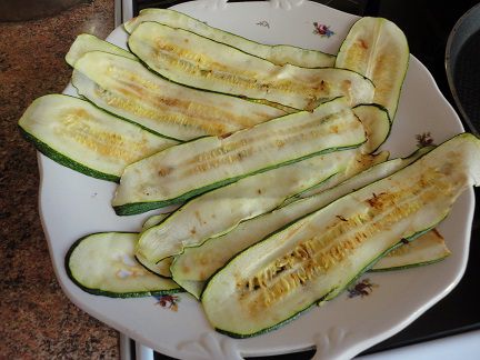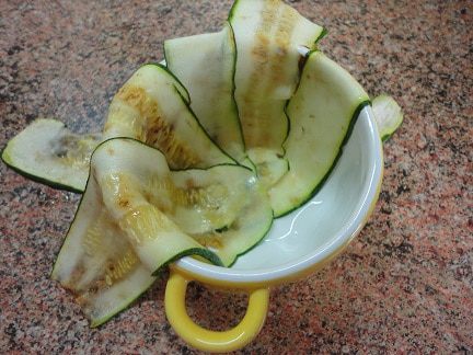 Кабачок ( у меня цукини) нарезать вдоль тонкими полосками и обжарить на сухой сковороде (с антипригарным покрытием) и немного посолить.