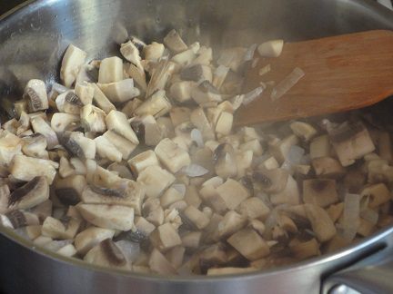 Лук нарезать кубиками и обжарить на растительном масле до прозрачности. Добавить грибы и жарит 3 минуты. Посолить, поперчить по вкусу.