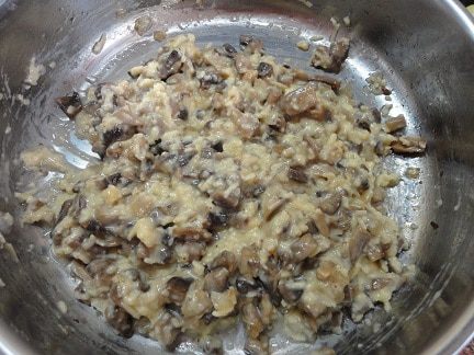 Яйцо соединить со сливками, мукой и добавить к грибам, туда же добавить натертый на мелкой терке сыр. Все перемешать.