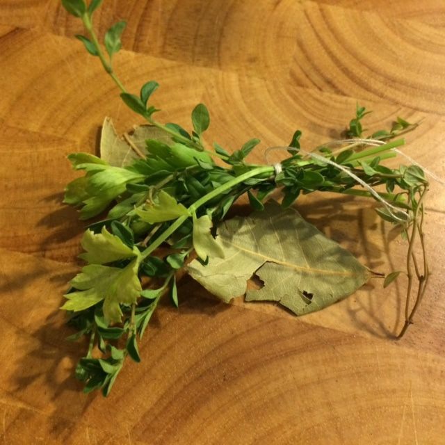 Свяжите веточки петрушки, тимьяна и лавровый лист вместе и добавить в кастрюлю. Уменьшите огонь и варите на медленном огне в течение 30 минут. Снять с огня и дать остыть.