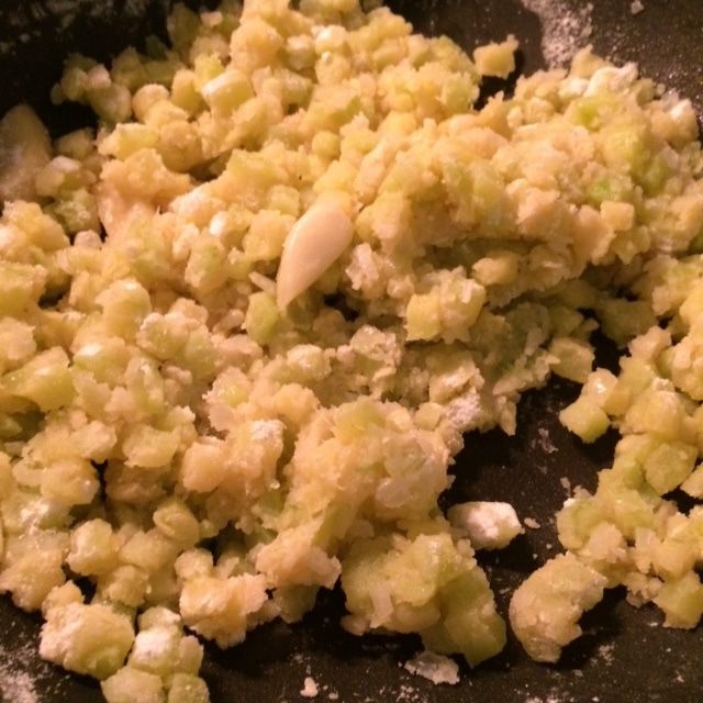 Порежьте лук, цукини и сельдерей, чеснок очистить.