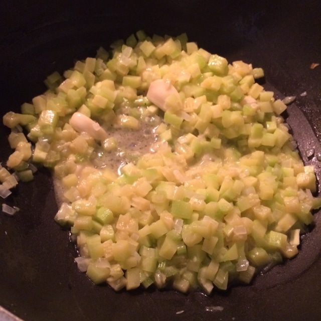 Уменьшите огонь до среднего, добавить лук, цукини, сельдерей, чеснок и готовьте, накрыв крышкой, помешивая, до мягкости около 8 минут.