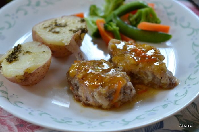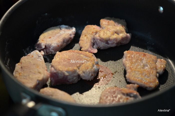 Обжарить медальоны на разогретой сковороде с оливковым маслом. Каждая сторона 3 мин. Добавить сверху мармеладную заготовку сверху и готовим еще примерно 20 мин. Я добавляла чуть воды, чтоб соус не подгорал