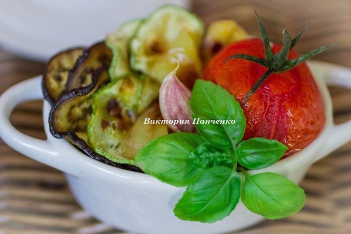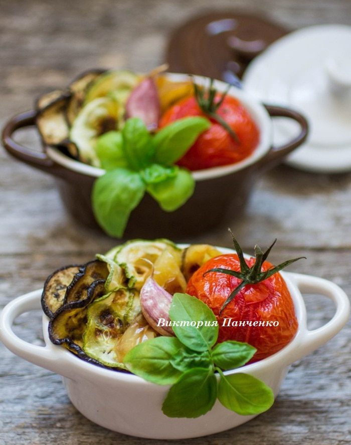 Готовые овощи разложить по порционным кокотницам или салатникам, украсить листикам базилика.