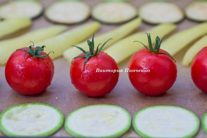 Овощи помыть и обсушить при помощи бумажного полотенца. Кабачки и баклажаны нарезать тонкими колечками. Чем тоньше будут колечки, тем меньше будет время запекания. Болгарские перцы освободить от семян и нарезать небольшими сегментами.