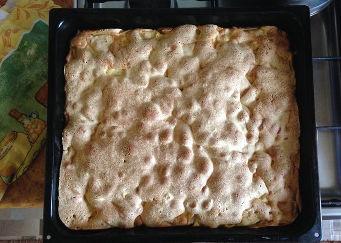 Тесто вылить на яблоки и отправить в, предварительно разогретую до 180 градусов, духовку и выпекать ~30 минут