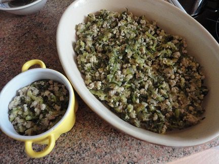 Фарш с овощами выложить в форму, залить смесью сыра и сливок, запекать около 15 минут в духовке. Подавать сфугато к столу горячим.