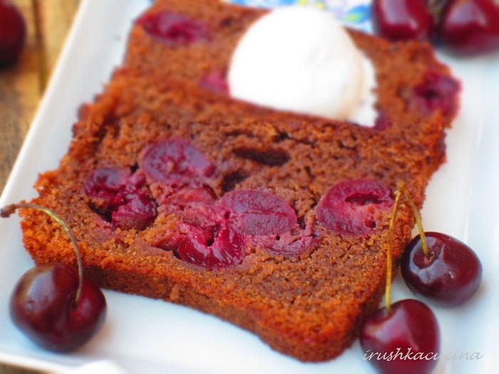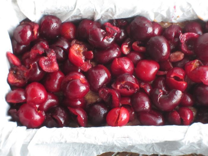 В прямоугольную форму с пергаментом выложить 1/3 часть теста.Сверху распределить черешню ......