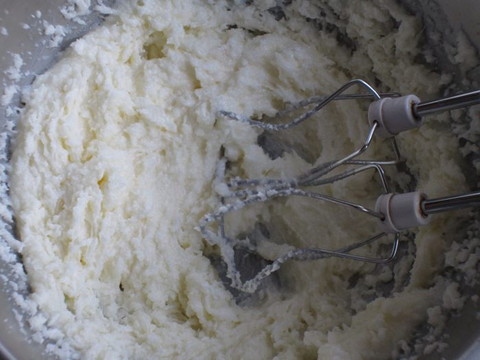 Миксером взбить сливочное масло с сахаром до пышной массы.