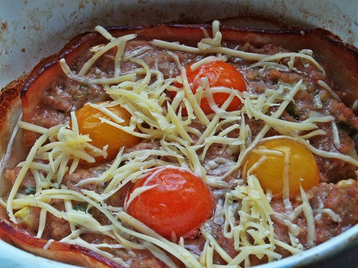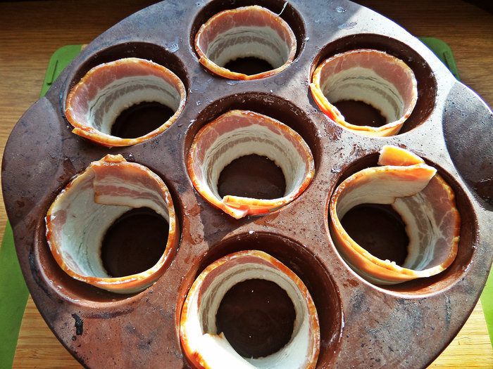 В ячейки формы для маффинов вдоль бортиков выстелить пластинки бекона.