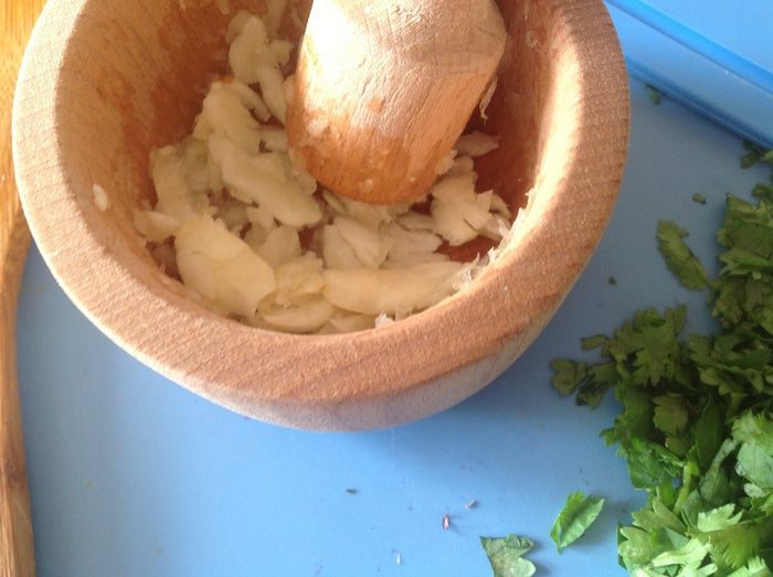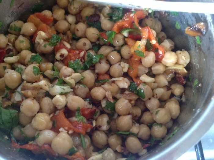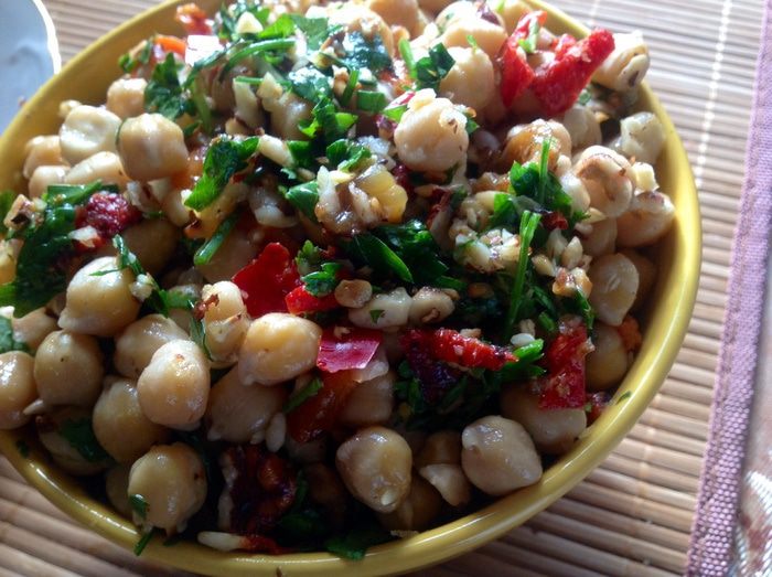 Пересыпаем смесь из сковороды в ступку или мисочку, добавляем разломанные крекеры, соль, петрушку и растираем еще немножко. Продолжая растирать, вливаем оливковое масло. Если паста густой получается, добавляем еще оливкового масла. Если все равно не помогает-отвар от нута.