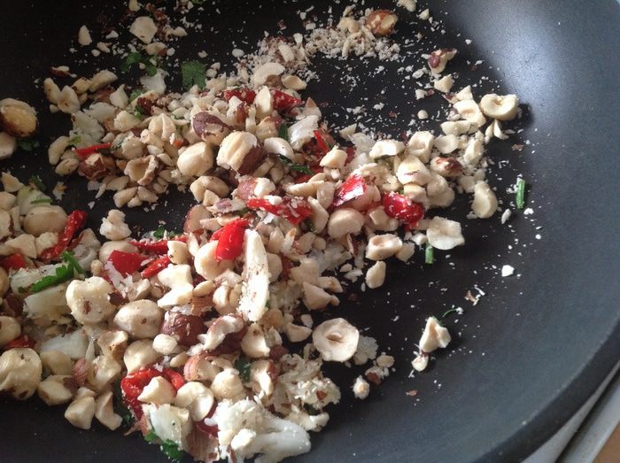 Поджариваем на сухой сковороде очищенный от семян чили с чесноком, фундуком и миндалем. (В этот раз миндаля у меня не было, поэтому без него) орехи не забываем предварительно измельчить в блендере.