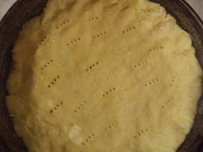 Форму смазать маслом, присыпать мукой, выстелить форму тестом, сделав бортик, наколоть тесто вилкой. Накрыть бумагой для выпечки, сверху насыпать сушёный горох.