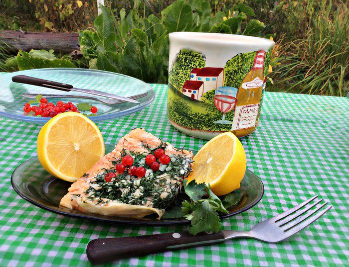 После запекания дать рыбе 5 мин "отдохнуть" в фольге, затем аккуратно развернуть и подавать к столу обильно сбрызнув лимонным соком.