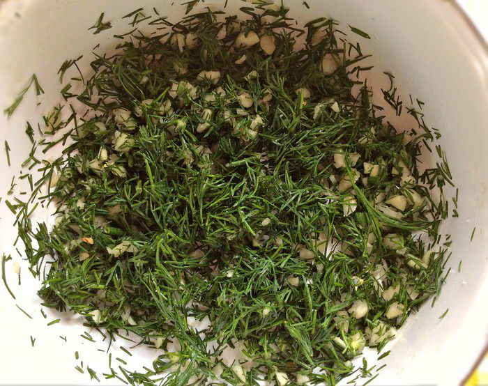 Укроп измельчить, мелко нарубить чеснок и перемешать с зеленью.