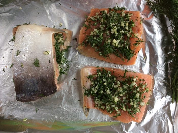 Возьмите лист фольги, смажьте совсем немного растительным маслом, положите на неё рыбу кожей вниз, сверху выложите зелень с чесноком и накройте второй половинкой филе.