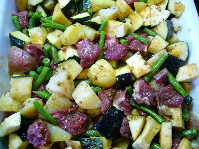В емкость для запекания выложить все овощи. Посолить, поперчить, посыпать специями. Добавить оливковое масло. Хорошо перемешать.