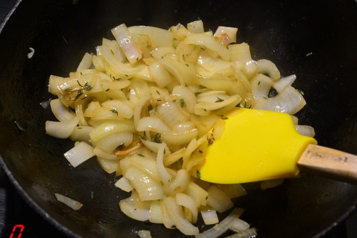 Вынуть веточки тимьяна, они нам больше не нужны. Добавить крупно нарезанный лук и 20 г сливочного масла. Пассеровать до прозрачного цвета.