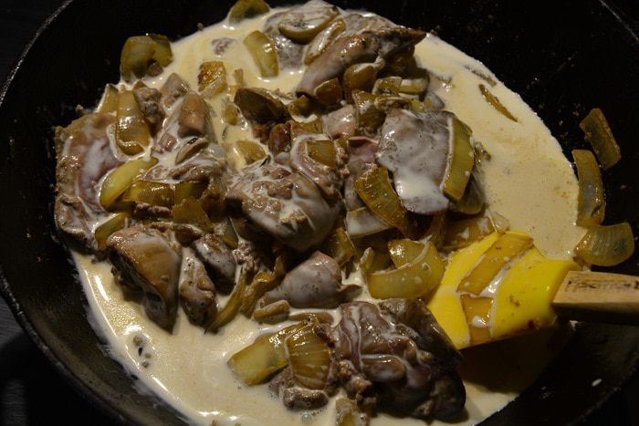 Добавить утиную печень (предварительно помыть), посолить, поперчить, перемешать. Жарить до полуготовности печени (примерно 4-5 минут).