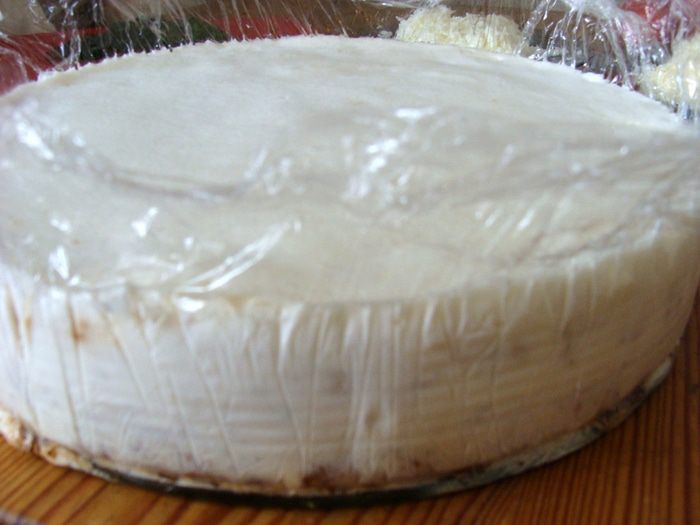 Борт разъемной формы я помыла и использовала форму заново, застелив пищевой пленкой, потом погрузила внутрь дно, на котором лежал корж.