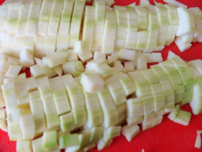 Один маленький кабачок (300-350г) очистить и порезать мелким кубиком.