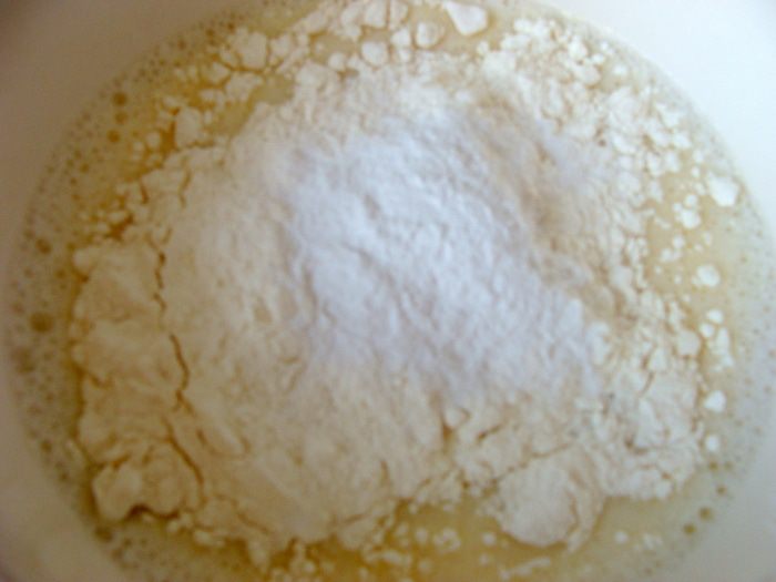 Яйца взбить с молоком и солью, добавить муку и разрыхлитель, взбить до однородной массы.