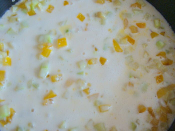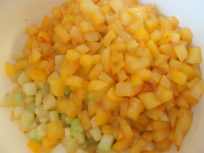 Желтый перец (можно красный или оранжевый) так же порезать и обжарить, присолив в конце. Перемешать с кабачком.