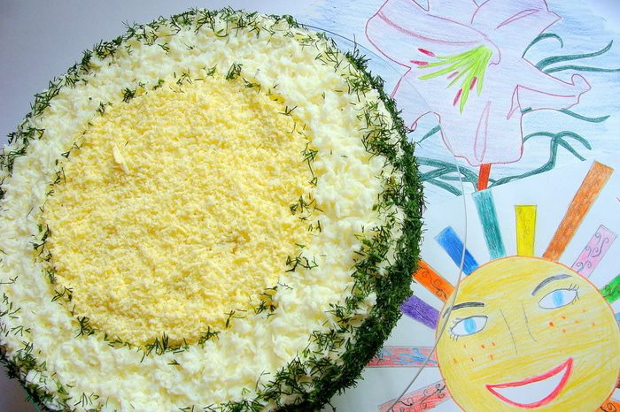 Для декора я использовала отдельно желток и отдельно белок, потертые на средней терке. Края присыпала рубленным укропом (только самые нежные листики)
