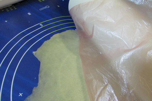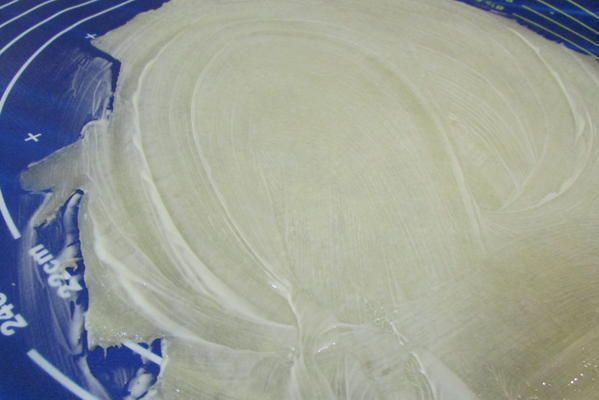Каждый пласт смазать размягченным сливочным маслом. Пласты сложить друг на друга. Вот здесь я допустила ошибку!!! Надо сложить 2 стопочки по 6 пластов, а у меня 1 стопка в 12 пластов. От этого бадамбура у меня получилась намного больше по размеру, чем должна была быть.
