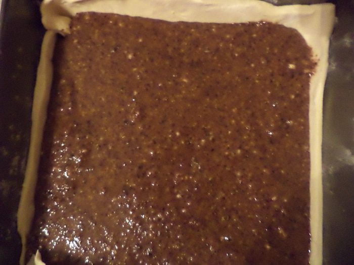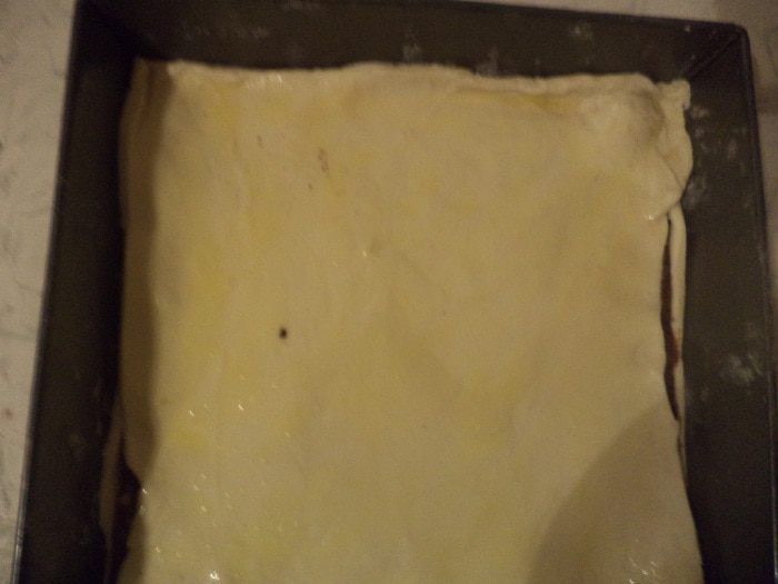 Слоёное тесто разморозить, раскатать тонким слоем. Вырезать из теста 2 пласта, один чуть больше, другой чуть меньше.
